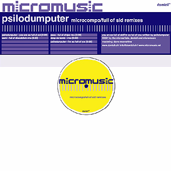 | Psilodumputer Microcompo/Full of SID remixes With Psilodumputer, Sami, Paza, DropDaBomb domizil 14, 2001 Maxi Single This is Micromusic's first vinyl maxi single released by domizil. It is also the first release from Micromusic which has involved the whole Micromusic community in the choice of tracks. The remixes of Psilodumputer's Full of Sid by Sami, Paza and DrobDaBomb were chosen by the community through Micromusic.net's online voting system. The result is five tracks that are quite different in style and shift: they range from Psilodumputer's dance floor brush (You're so full of sid) and bonus track (I'm so full of you), to weirdo solo-entertainer tunes by Sami (Full of discobitch) and to the hilarious bleeps from Paza. |